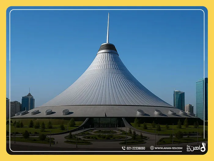 این بنا با ارتفاع 150 متر، عنوان بزرگترین سازه کششی جهان را به خود اختصاص داده و از دور، شبیه یک چادر سنتی قزاقی دیده می شود؛ نمادی فرهنگی که با مهارت مهندسی روز دنیا ترکیب شده است.